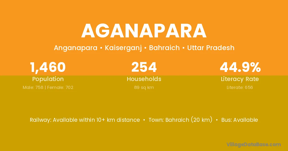 Bahraich (20 km) is the nearest town to Aganapara village for major economic activities and is located approximately 20 km away.