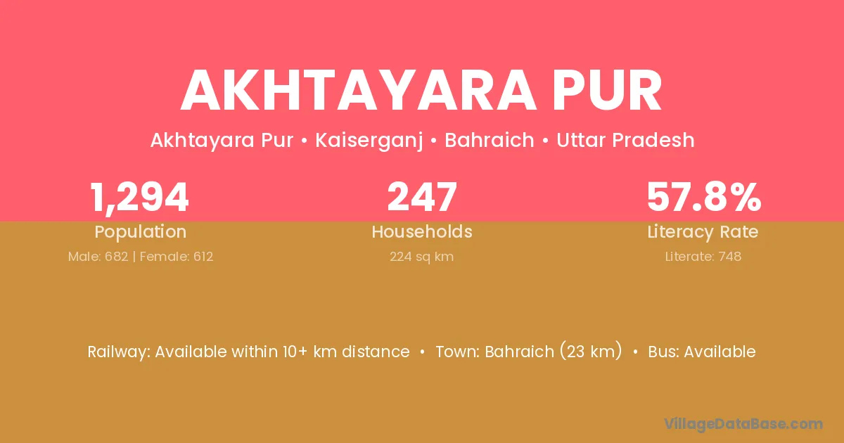 Bahraich (23 km) is the nearest town to Akhtayara Pur village for major economic activities and is located approximately 23 km away.