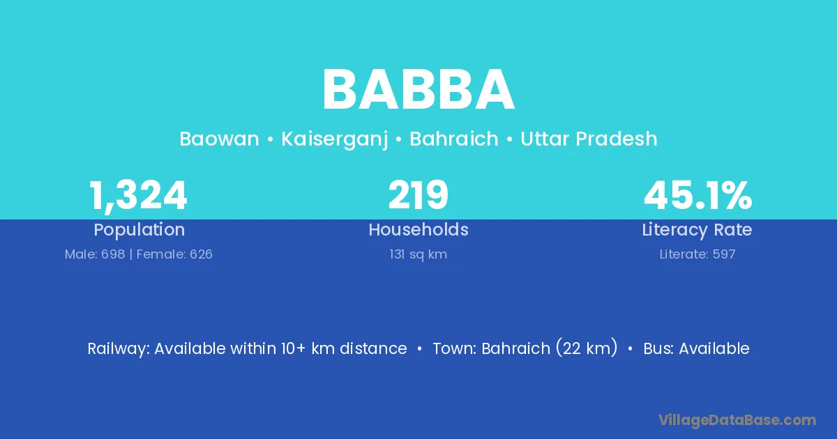 Bahraich (22 km) is the nearest town to Babba village for major economic activities and is located approximately 22 km away.