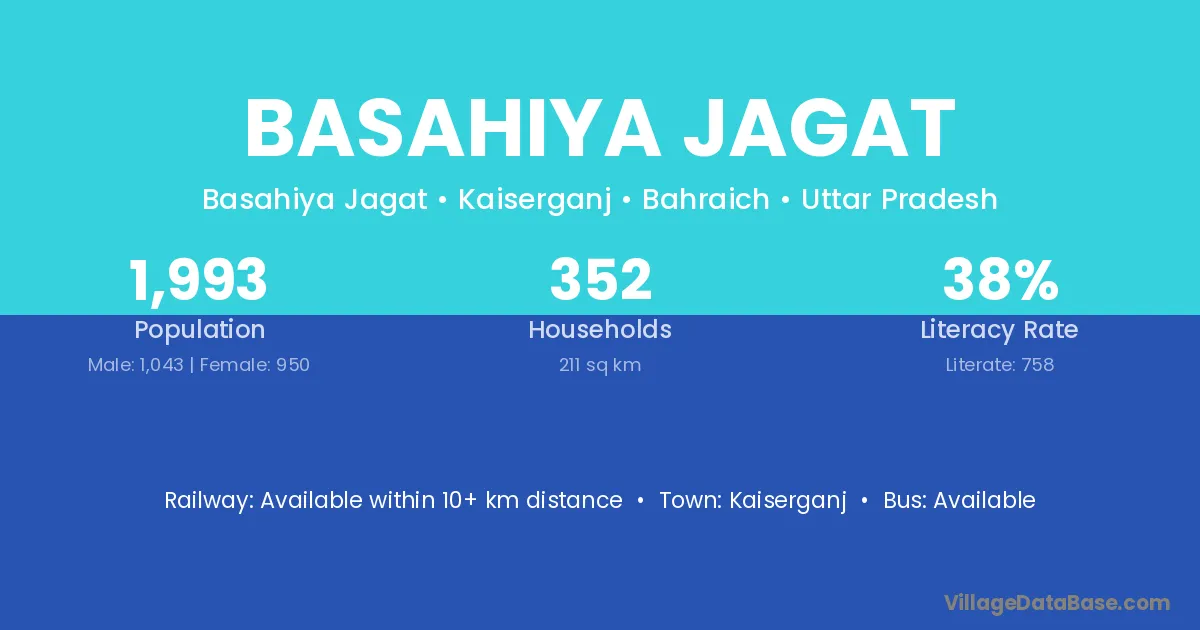 Basahiya Jagat village has a total population of 1,993 people, of which 1,043 are males and 950 are females.