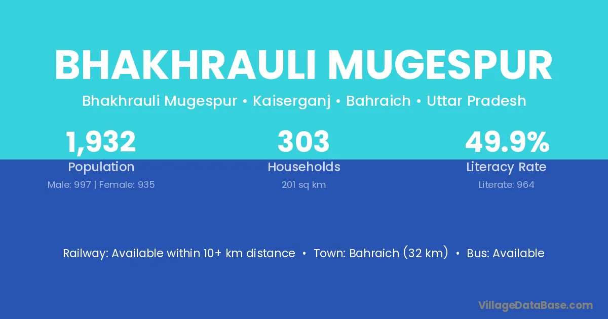 Bahraich (32 km) is the nearest town to Bhakhrauli Mugespur village for major economic activities and is located approximately 32 km away.