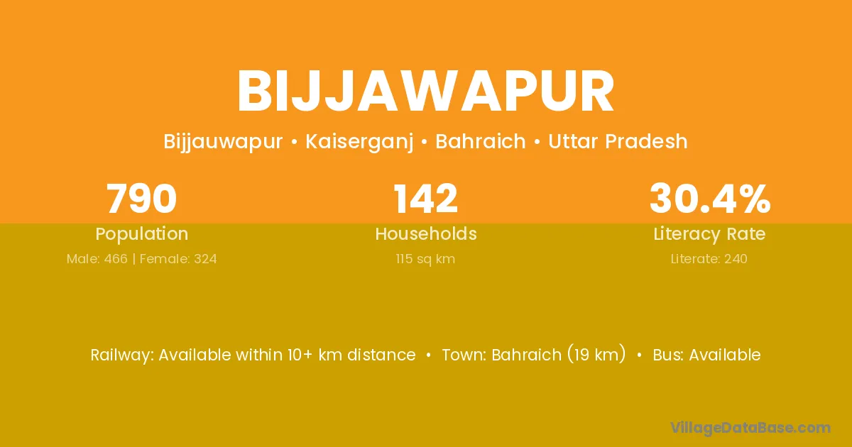Bahraich (19 km) is the nearest town to Bijjawapur village for major economic activities and is located approximately 19 km away.
