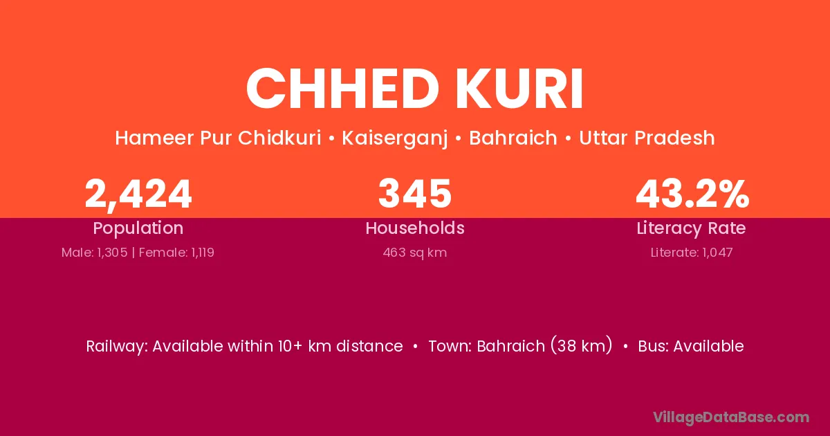 Bahraich (38 km) is the nearest town to Chhed Kuri village for major economic activities and is located approximately 38 km away.