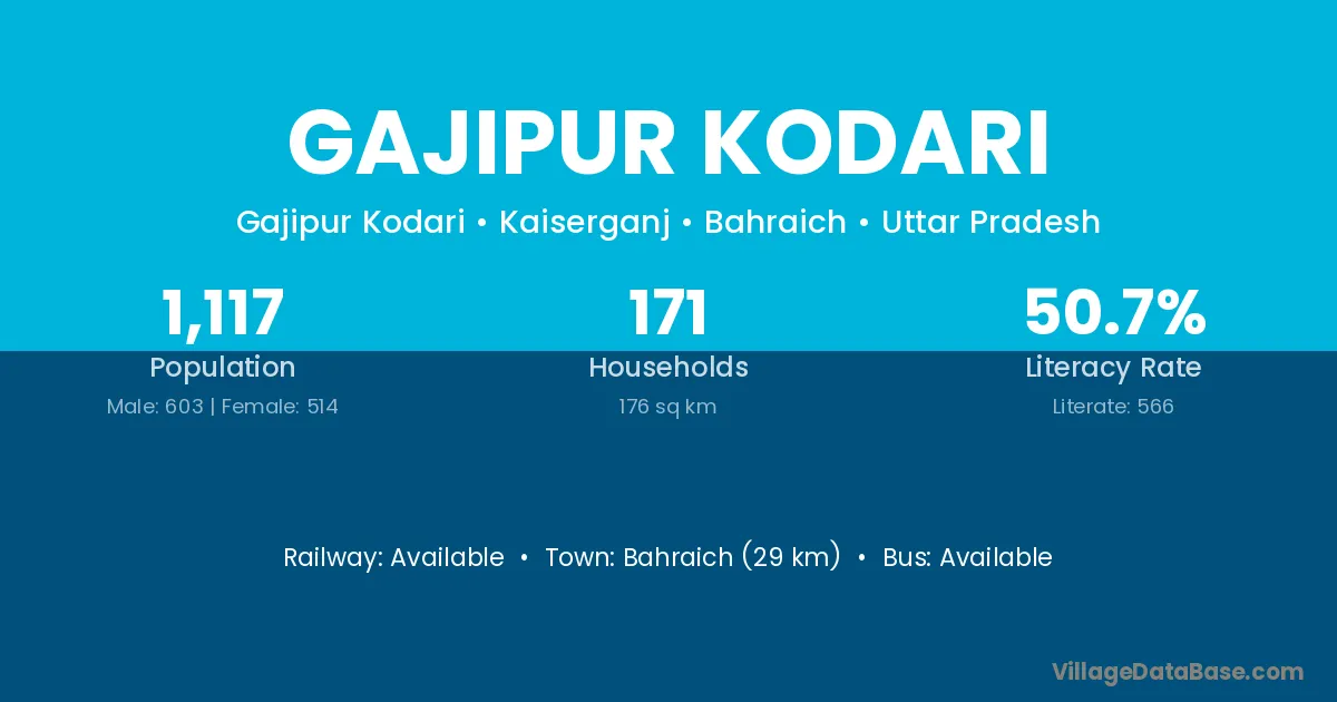 Bahraich (29 km) is the nearest town to Gajipur Kodari village for major economic activities and is located approximately 29 km away.