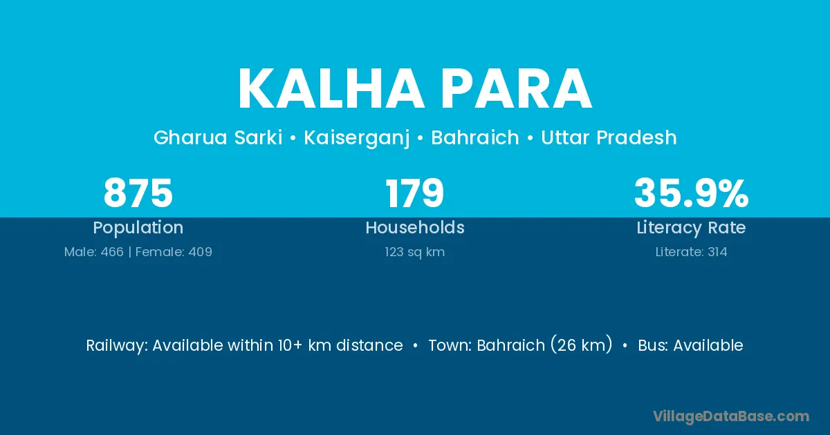 Bahraich (26 km) is the nearest town to Kalha Para village for major economic activities and is located approximately 26 km away.