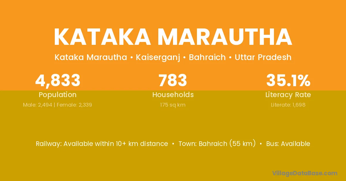 Bahraich (55 km) is the nearest town to Kataka Marautha village for major economic activities and is located approximately 55 km away.