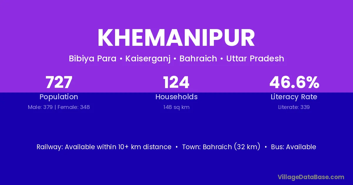 Bahraich (32 km) is the nearest town to Khemanipur village for major economic activities and is located approximately 32 km away.
