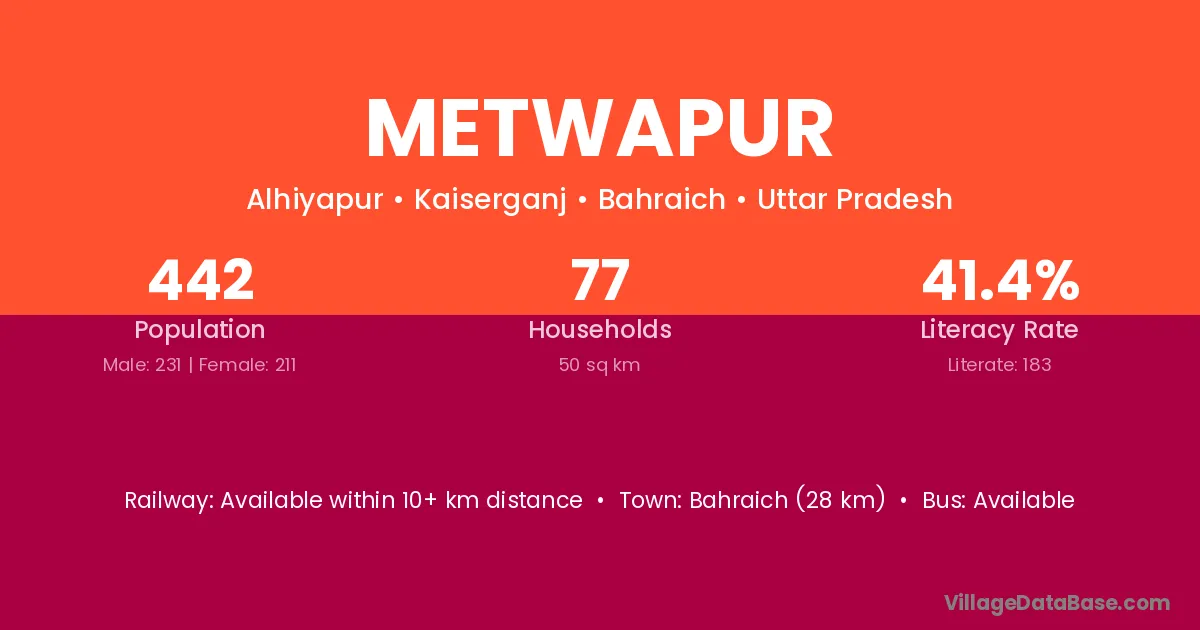 Bahraich (28 km) is the nearest town to Metwapur village for major economic activities and is located approximately 28 km away.