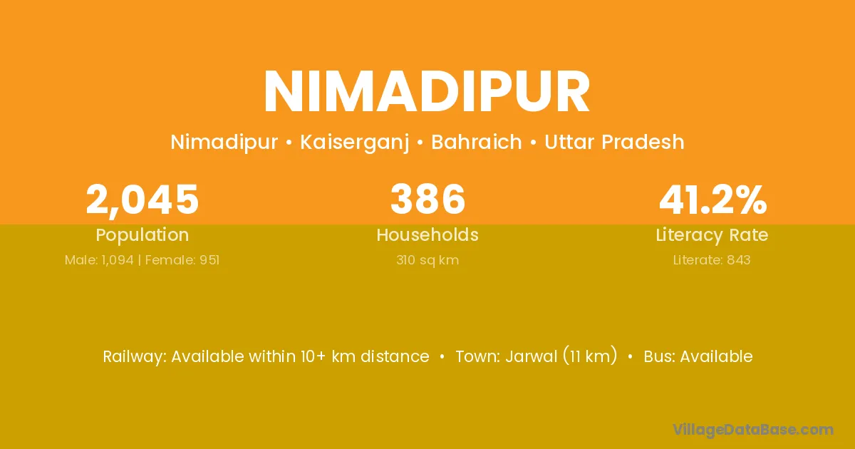 Jarwal (11 km) is the nearest town to Nimadipur village for major economic activities and is located approximately 11 km away.