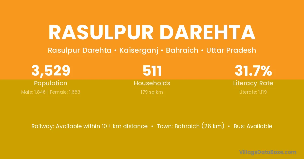 Bahraich (26 km) is the nearest town to Rasulpur Darehta village for major economic activities and is located approximately 26 km away.