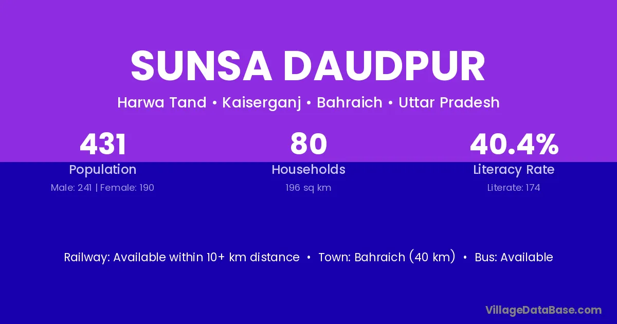 Bahraich (40 km) is the nearest town to Sunsa Daudpur village for major economic activities and is located approximately 40 km away.