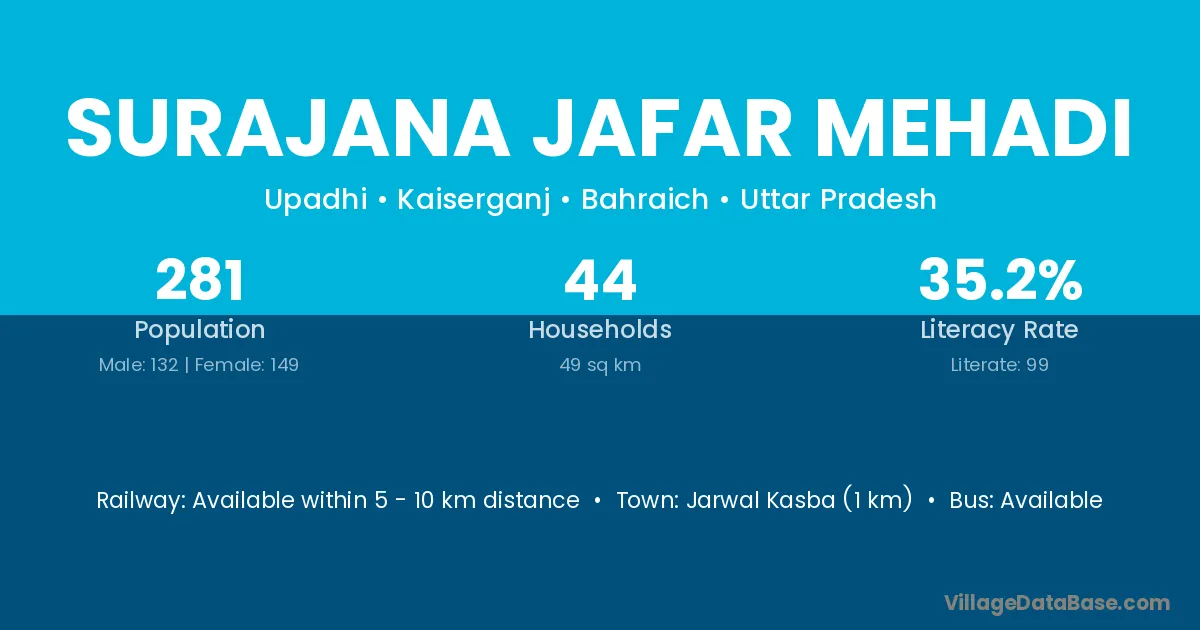 Jarwal Kasba (1 km) is the nearest town to Surajana Jafar Mehadi village for major economic activities and is located approximately 1 km away.