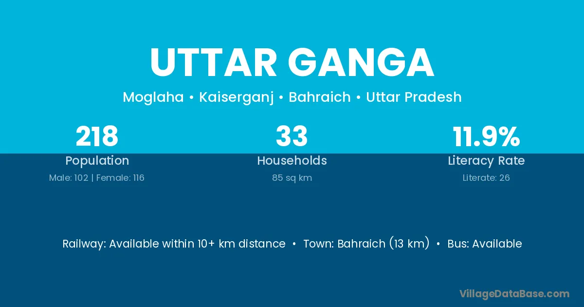 Bahraich (13 km) is the nearest town to Uttar Ganga village for major economic activities and is located approximately 13 km away.