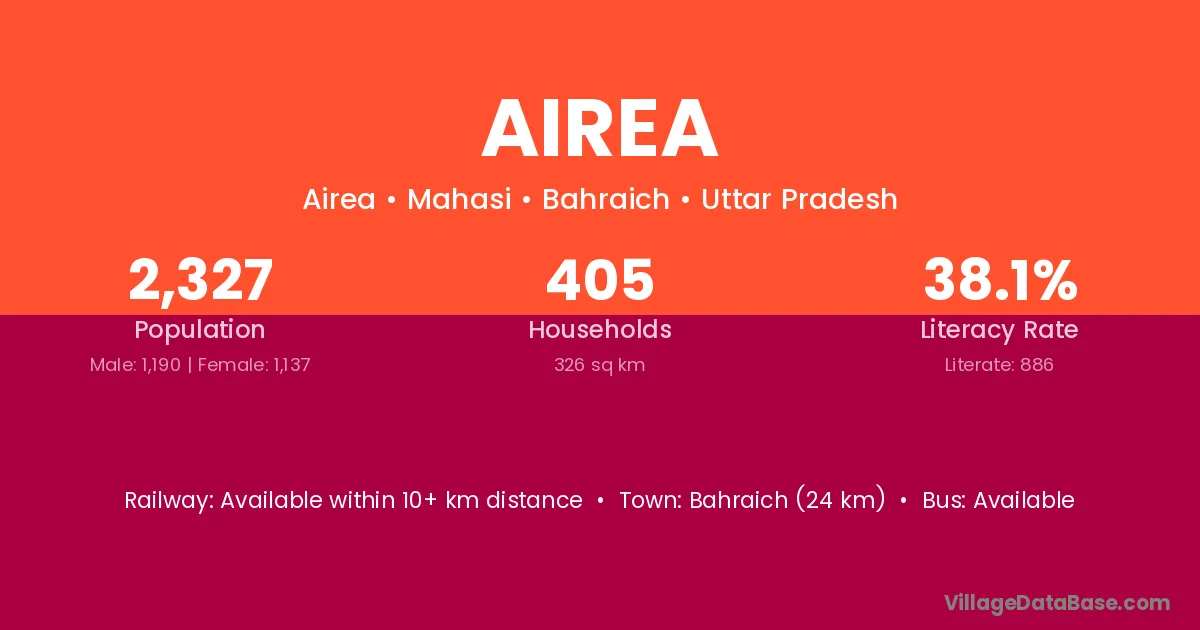 Bahraich (24 km) is the nearest town to Airea village for major economic activities and is located approximately 24 km away.