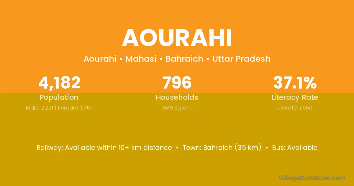 Bahraich (35 km) is the nearest town to Aourahi village for major economic activities and is located approximately 35 km away.