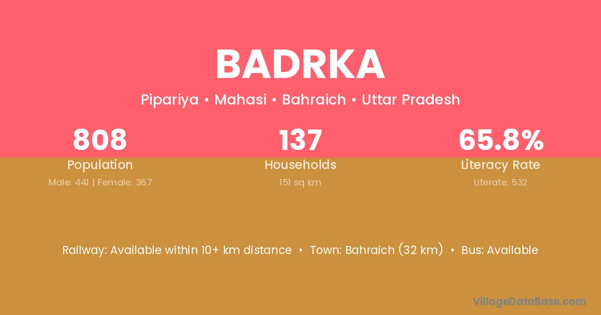 Bahraich (32 km) is the nearest town to Badrka village for major economic activities and is located approximately 32 km away.