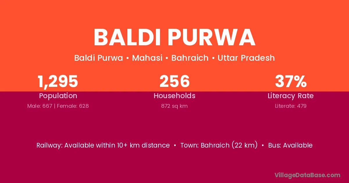Bahraich (22 km) is the nearest town to Baldi Purwa village for major economic activities and is located approximately 22 km away.