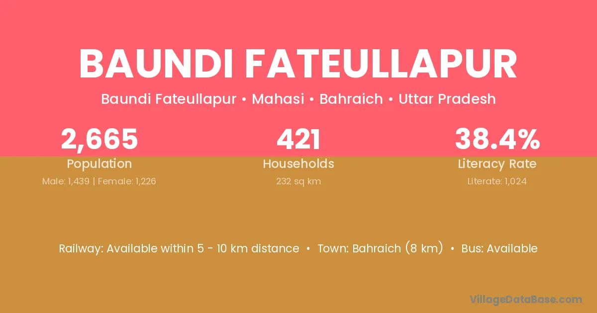 Bahraich (8 km) is the nearest town to Baundi Fateullapur village for major economic activities and is located approximately 8 km away.