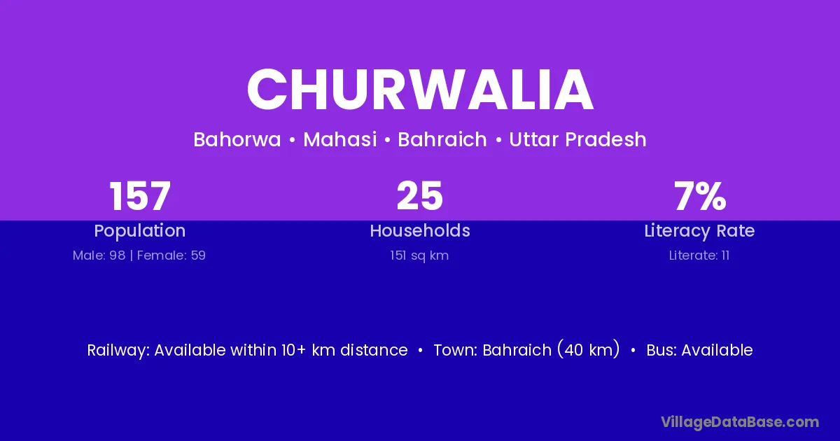 Bahraich (40 km) is the nearest town to Churwalia village for major economic activities and is located approximately 40 km away.