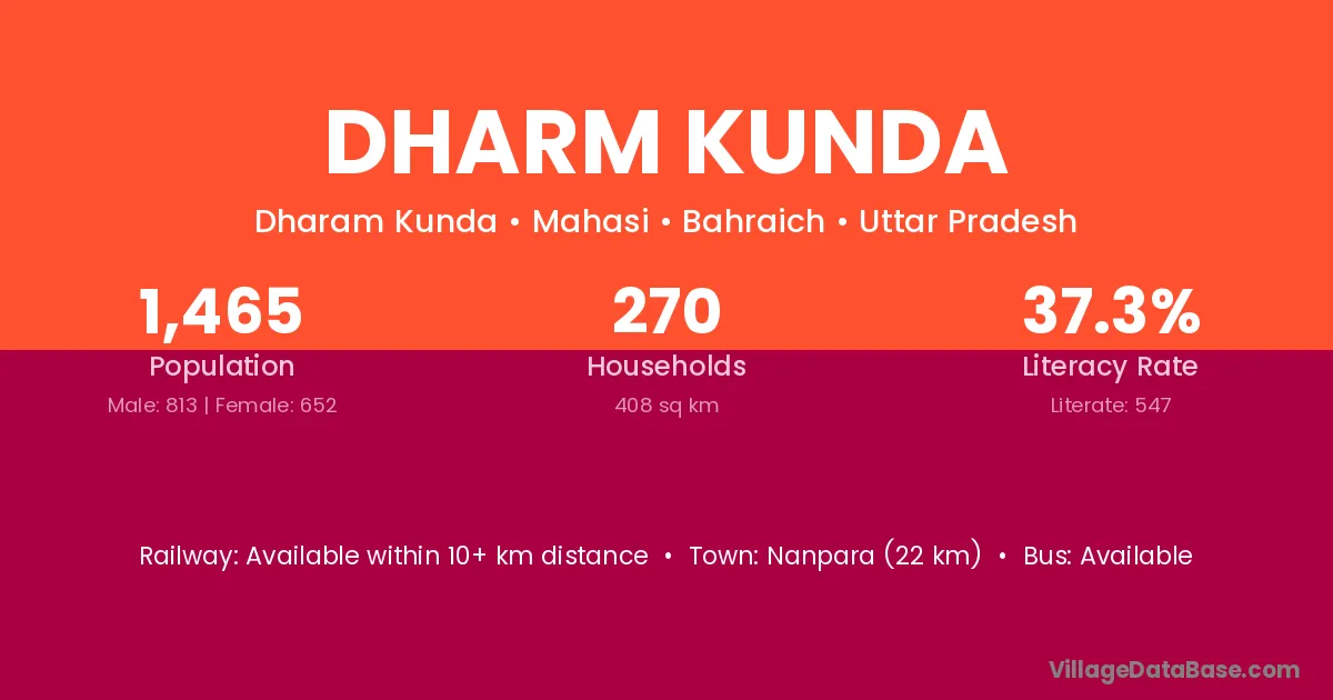 Nanpara (22 km) is the nearest town to Dharm Kunda village for major economic activities and is located approximately 22 km away.