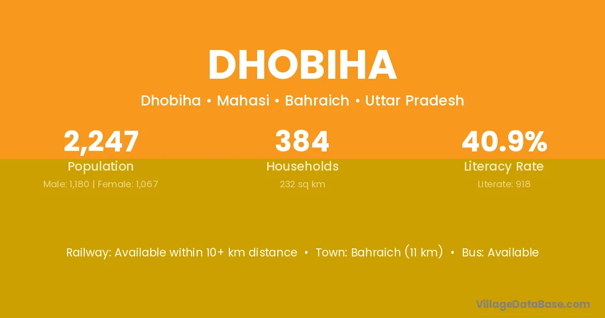Bahraich (11 km) is the nearest town to Dhobiha village for major economic activities and is located approximately 11 km away.