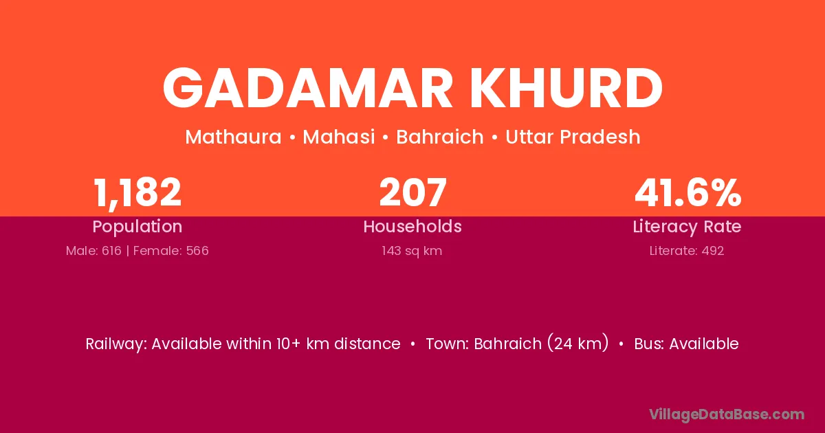 Bahraich (24 km) is the nearest town to Gadamar Khurd village for major economic activities and is located approximately 24 km away.