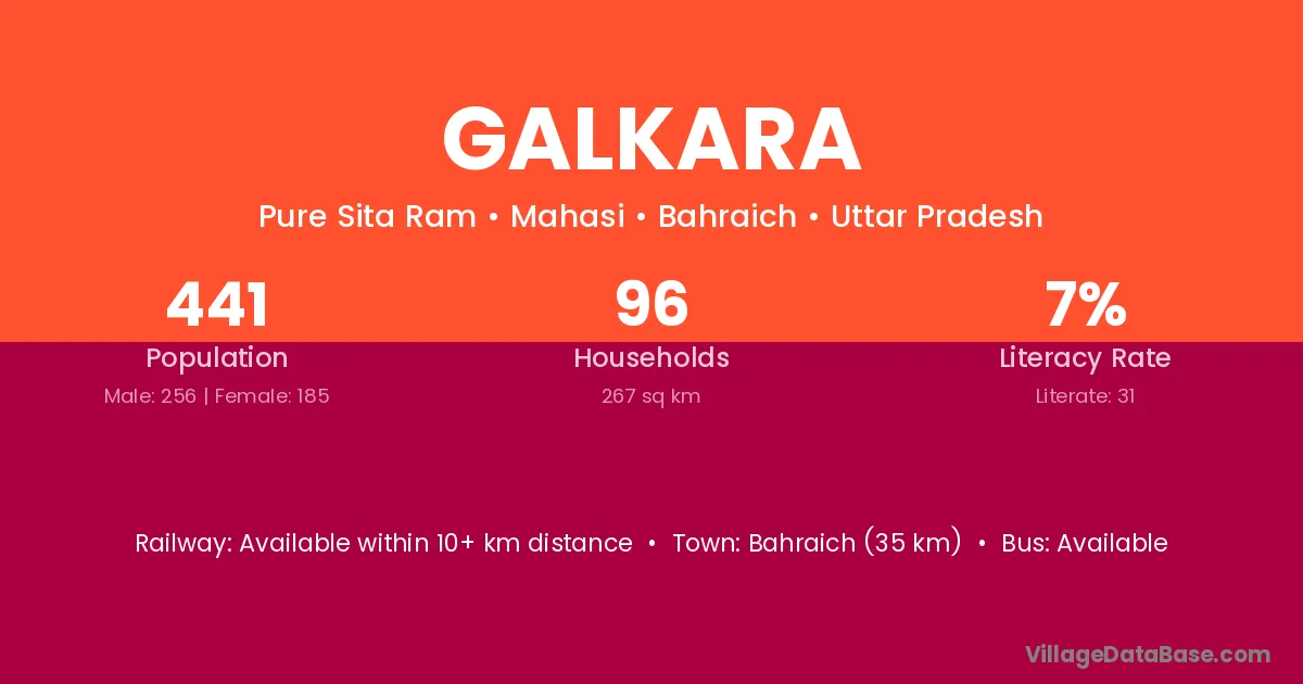 Bahraich (35 km) is the nearest town to Galkara village for major economic activities and is located approximately 35 km away.