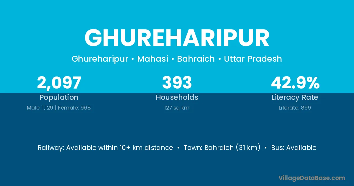 Bahraich (31 km) is the nearest town to Ghureharipur village for major economic activities and is located approximately 31 km away.