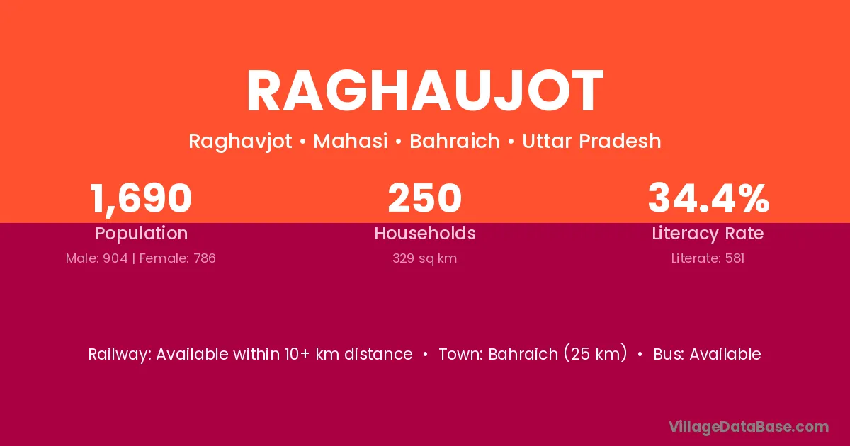 Bahraich (25 km) is the nearest town to Raghaujot village for major economic activities and is located approximately 25 km away.
