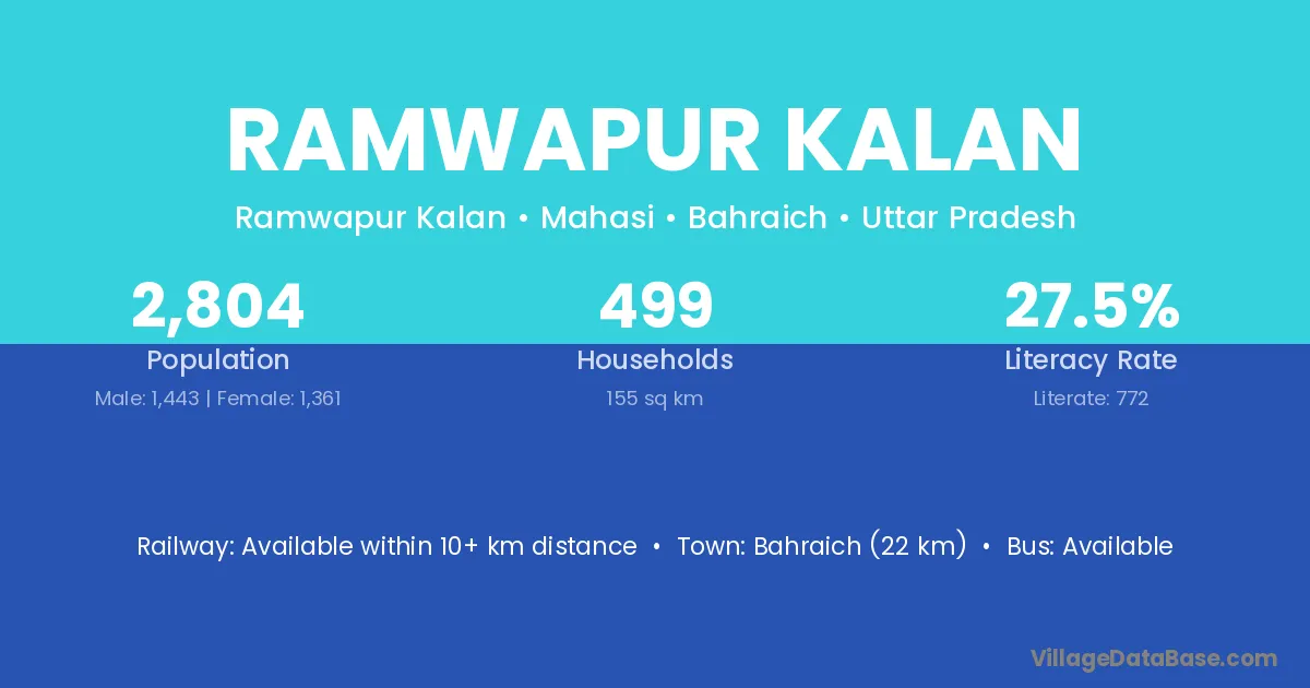 Bahraich (22 km) is the nearest town to Ramwapur Kalan village for major economic activities and is located approximately 22 km away.