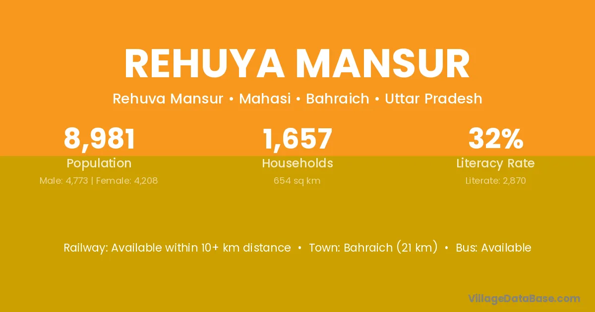 Bahraich (21 km) is the nearest town to Rehuya Mansur village for major economic activities and is located approximately 21 km away.