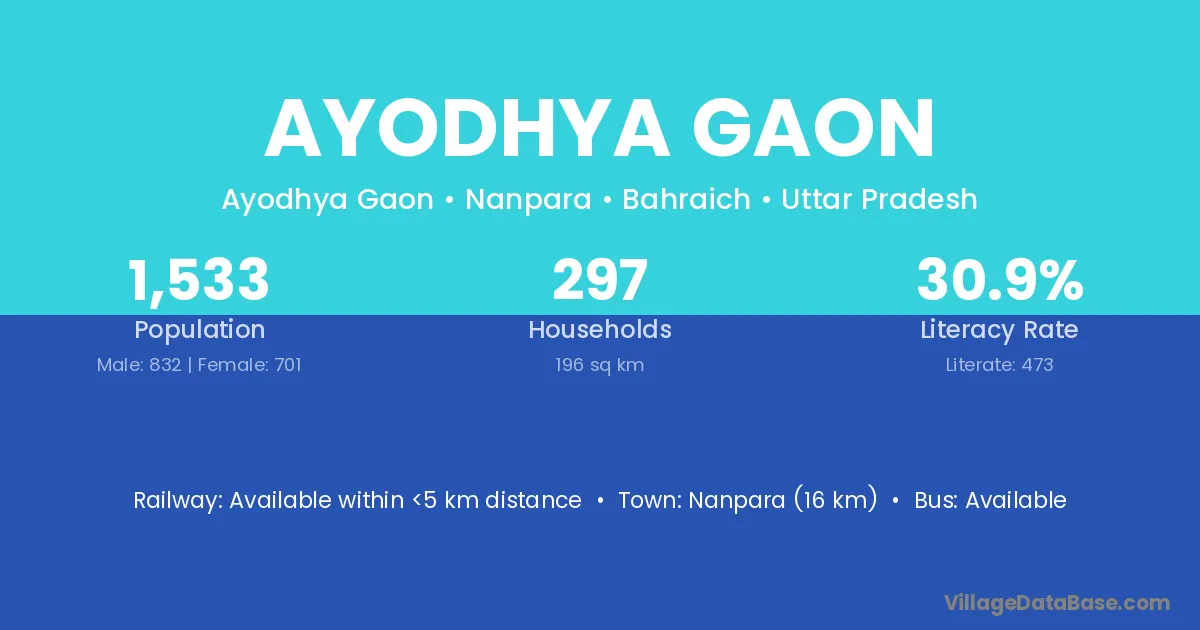 Nanpara (16 km) is the nearest town to Ayodhya Gaon village for major economic activities and is located approximately 16 km away.