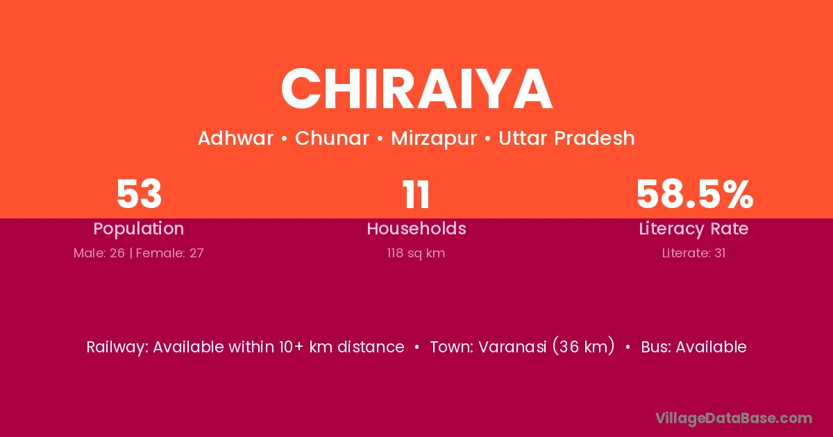 The literacy rate of Chiraiya village is 27.00%. Male literacy stands at 32.23% and female literacy at 21.16%.