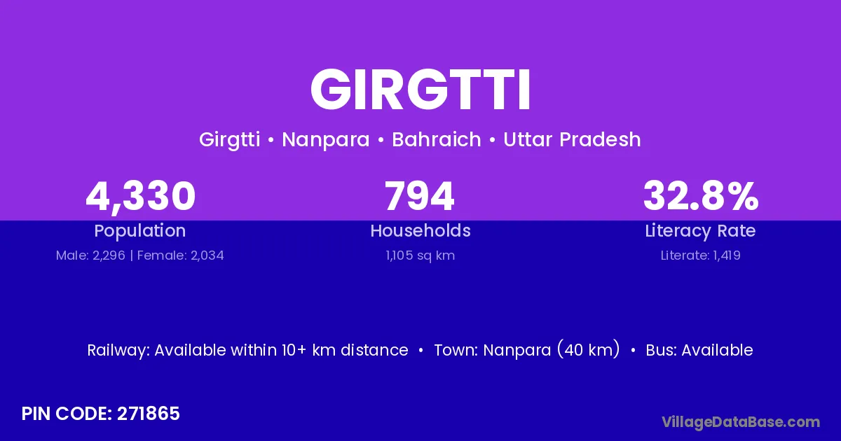 Nanpara (40 km) is the nearest town to Girgtti village for major economic activities and is located approximately 40 km away.