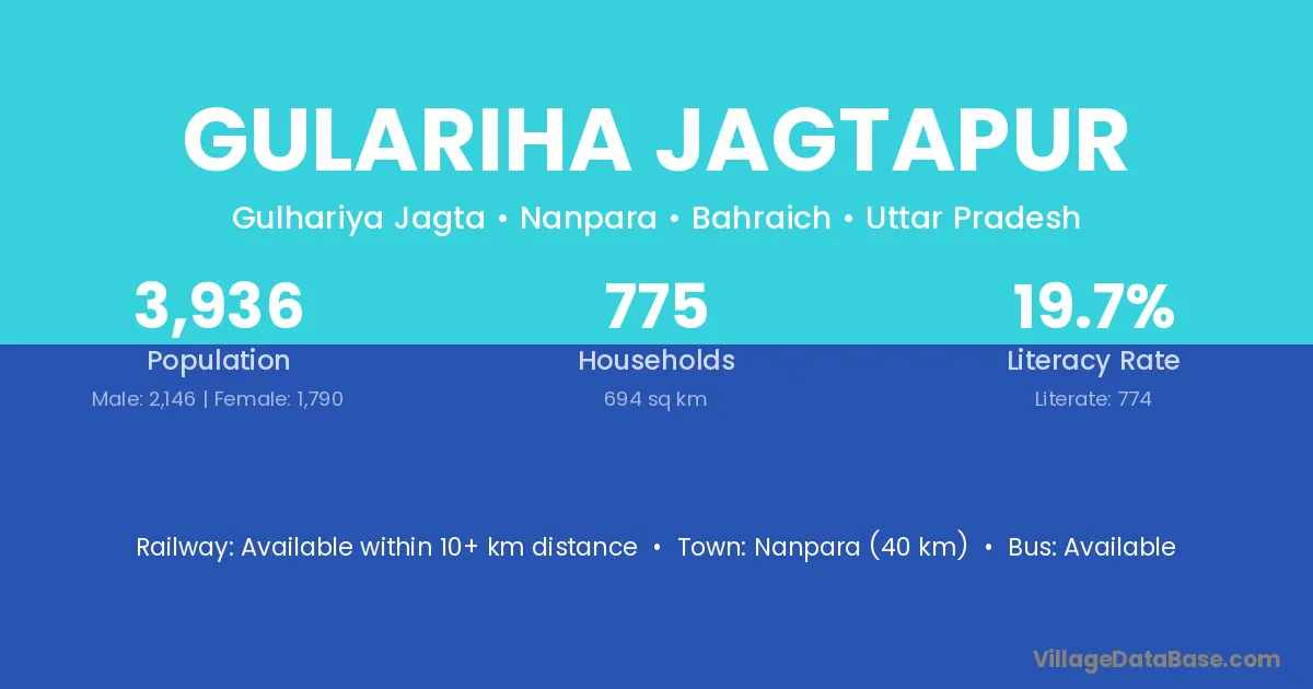 Nanpara (40 km) is the nearest town to Gulariha Jagtapur village for major economic activities and is located approximately 40 km away.