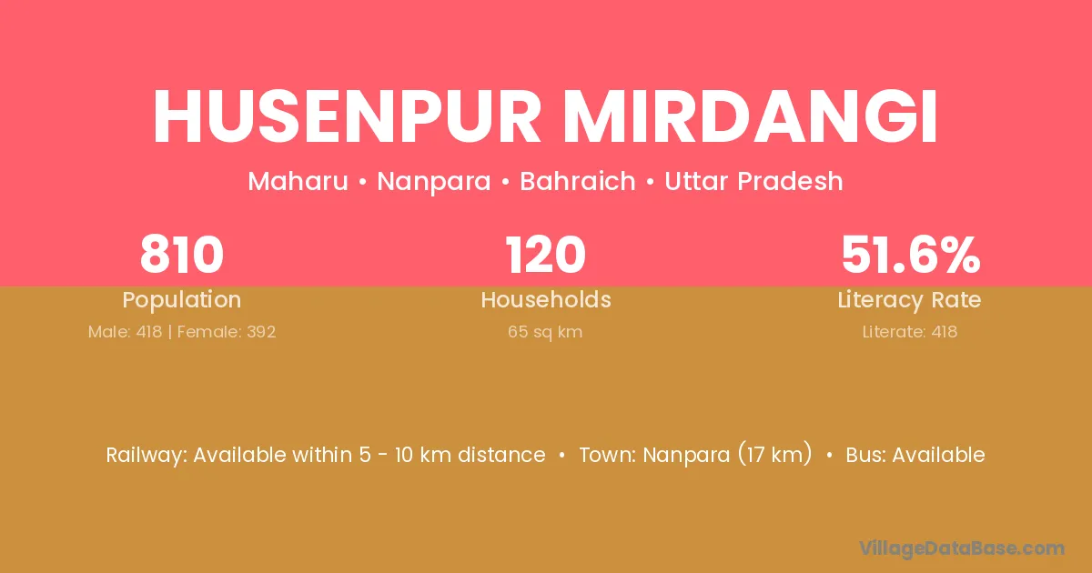 Nanpara (17 km) is the nearest town to Husenpur Mirdangi village for major economic activities and is located approximately 17 km away.