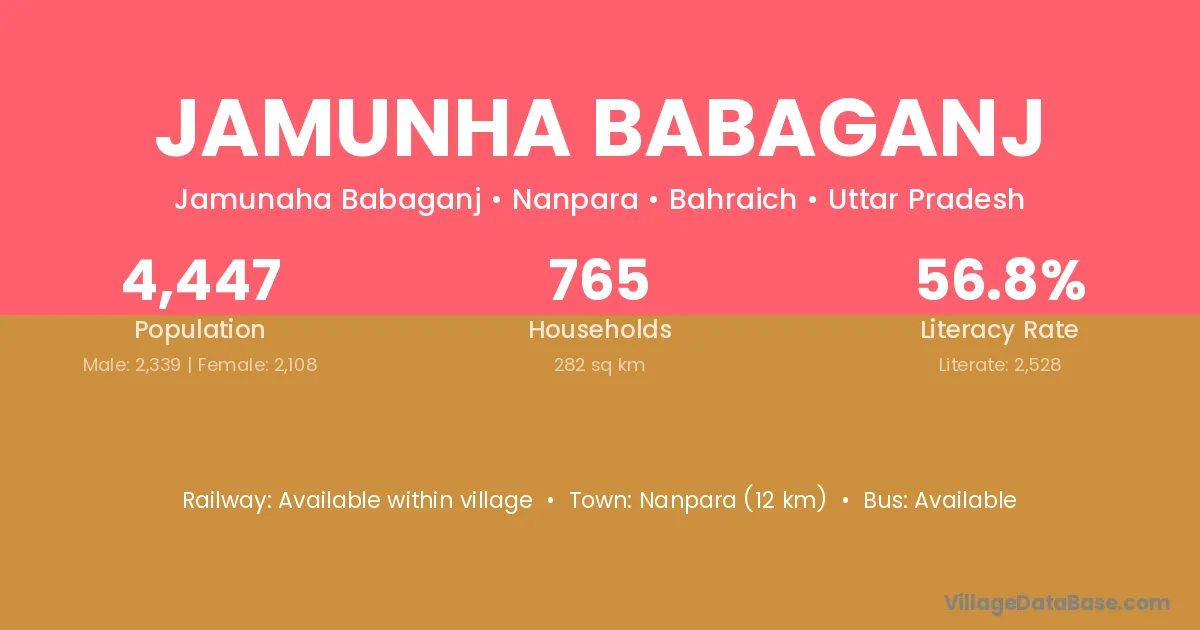 Jamunha Babaganj village has a total population of 4,447 people, of which 2,339 are males and 2,108 are females.