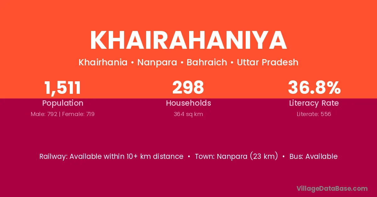 Nanpara (23 km) is the nearest town to Khairahaniya village for major economic activities and is located approximately 23 km away.