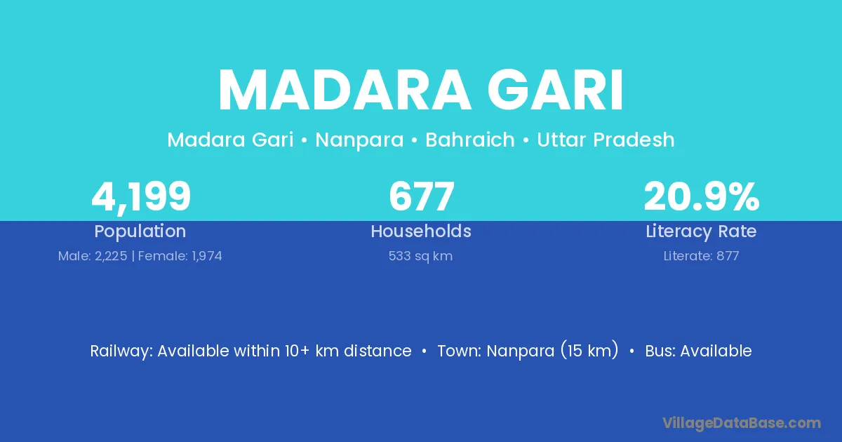 Nanpara (15 km) is the nearest town to Madara Gari village for major economic activities and is located approximately 15 km away.