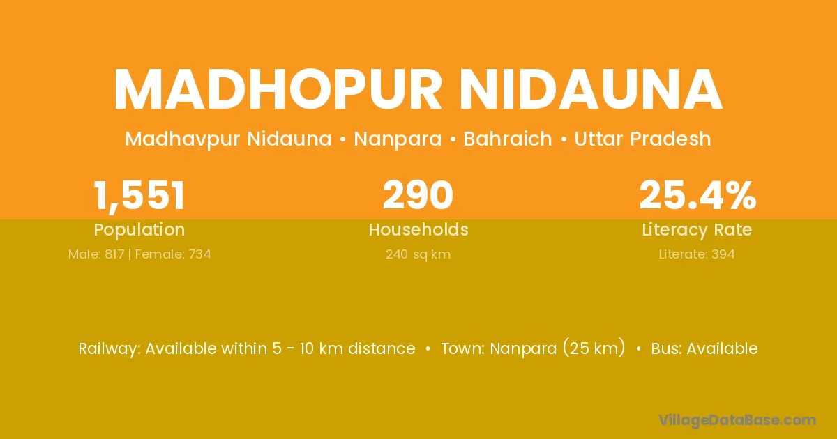 Nanpara (25 km) is the nearest town to Madhopur Nidauna village for major economic activities and is located approximately 25 km away.