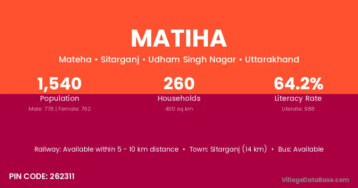 Matiha village has a total population of 2,632 people, of which 1,446 are males and 1,186 are females.