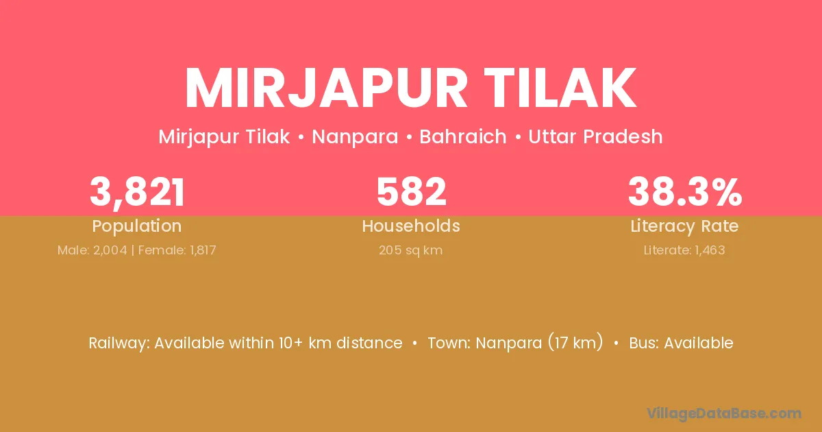 Nanpara (17 km) is the nearest town to Mirjapur Tilak village for major economic activities and is located approximately 17 km away.