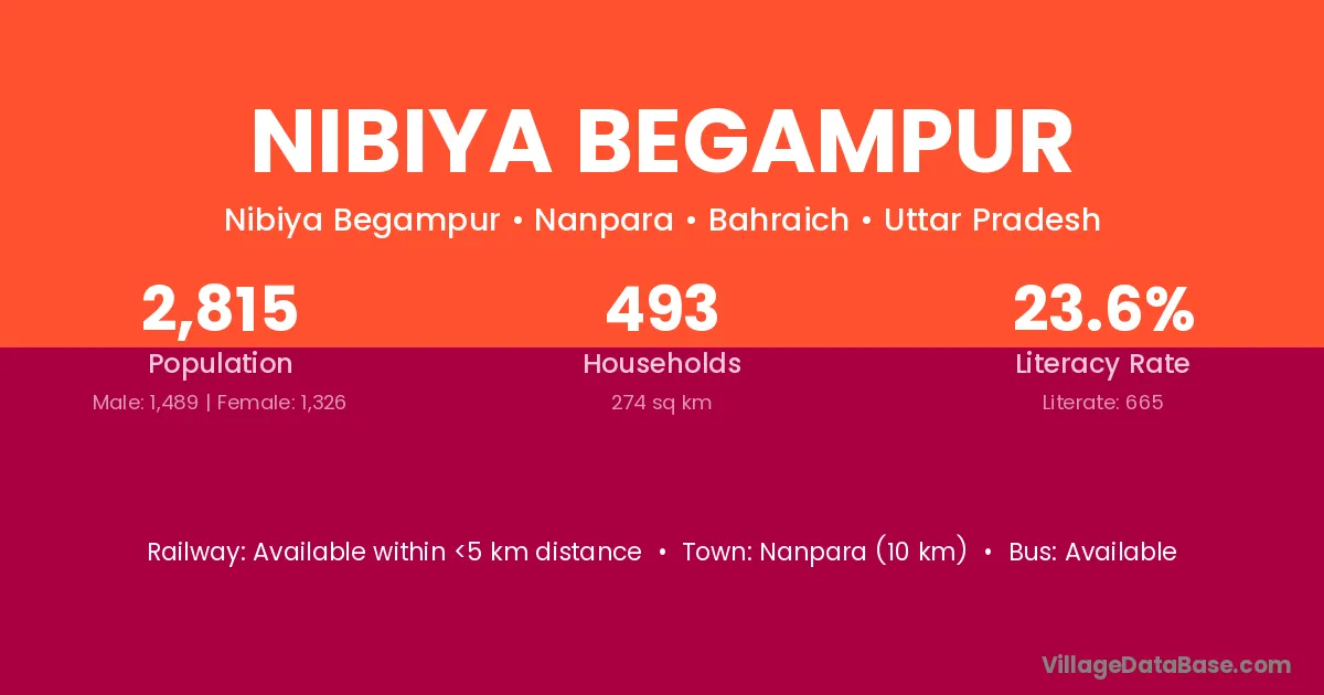 Nanpara (10 km) is the nearest town to Nibiya Begampur village for major economic activities and is located approximately 10 km away.