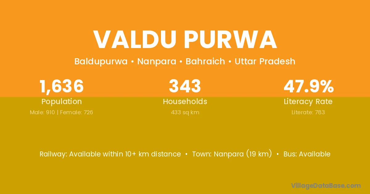 Nanpara (19 km) is the nearest town to Valdu Purwa village for major economic activities and is located approximately 19 km away.