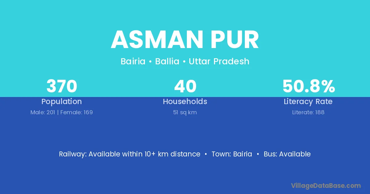 Asman Pur village has a total population of 370 people, of which 201 are males and 169 are females.
