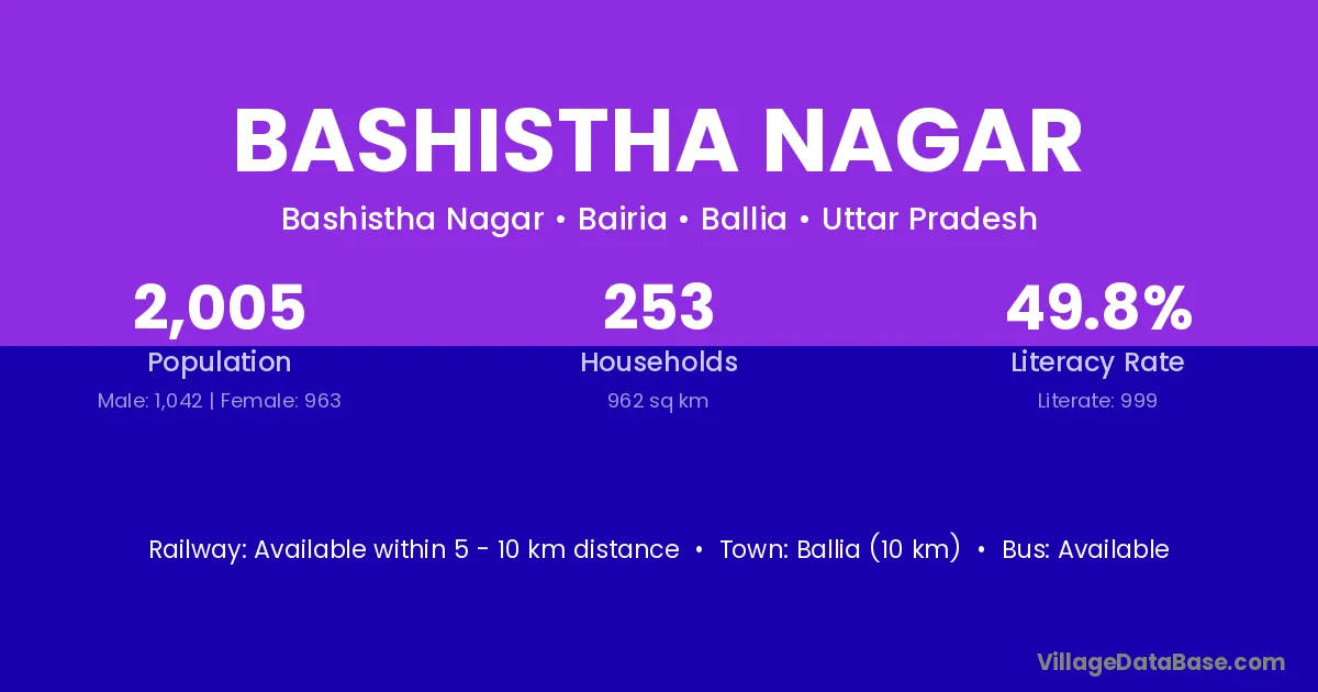 Ballia (10 km) is the nearest town to Bashistha Nagar village for major economic activities and is located approximately 10 km away.