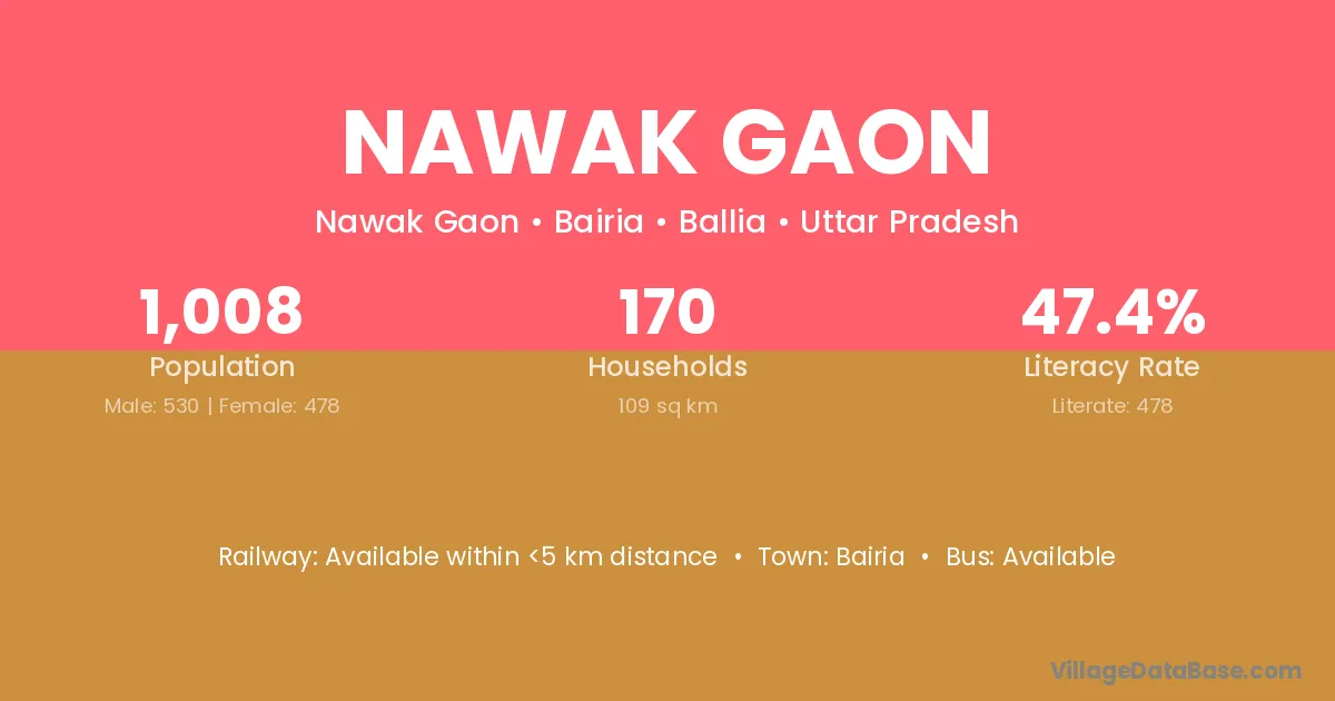 Nawak Gaon village has a total population of 1,008 people, of which 530 are males and 478 are females.