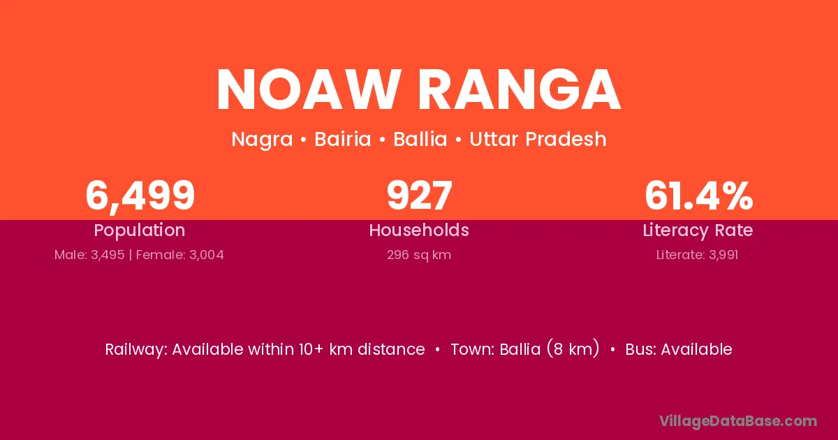 Ballia (8 km) is the nearest town to Noaw Ranga village for major economic activities and is located approximately 8 km away.