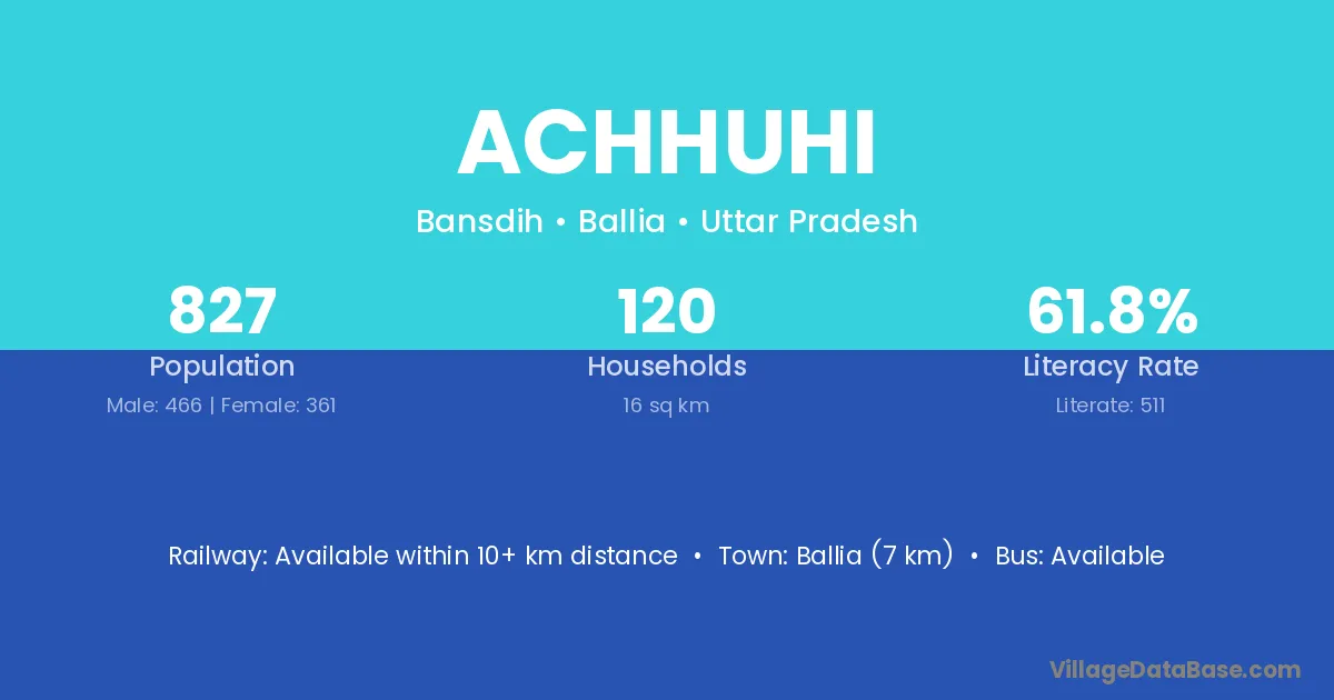 Ballia (7 km) is the nearest town to Achhuhi village for major economic activities and is located approximately 7 km away.