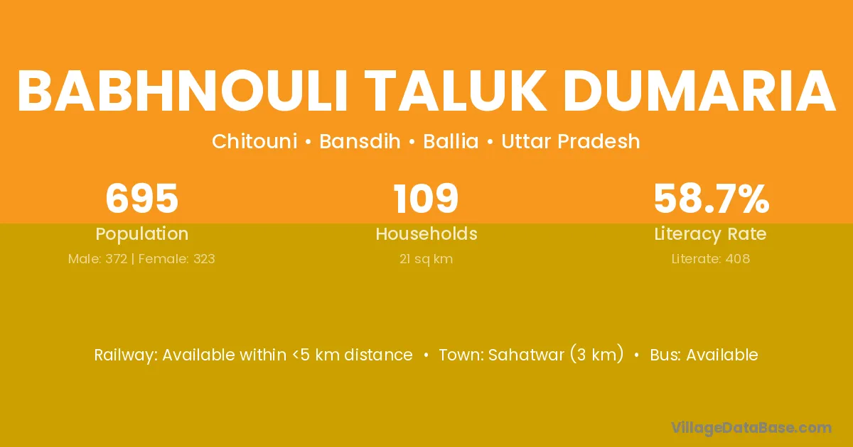 Babhnouli Taluk Dumaria village has a total population of 695 people, of which 372 are males and 323 are females.